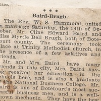 The Rev. W. S. Hammond united in marriage Saturday, the 14th of October, Mr. Cline Edward Baird and Miss Myrtle Bell Brugh, both of Botetourt county. The ceremony took place at Trinity Methodist church, in the presence of a few relatives and friends.