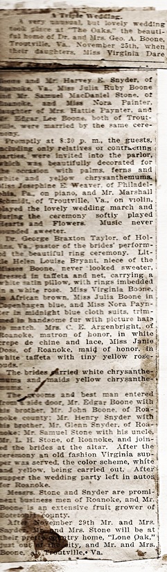A very unusual, but lovely wedding took place at 'The Oaks,' the beautiful home of Dr. and Mrs. Geo. A. Boone, Troutville, Va., November 25th, when their daughters, Miss Virginia Dare Boone and Mr. Harvey E. Snyder, of Roanoke, Va., Miss Julia Ruby Boone and Mr. Samuel MacDaniel Stone, of Roanoke, and Miss Nora Painter, daughter of Mrs. Hattie Paynter, and Mr. Edgar Lee Boone, both of Troutville, were married by the same ceremony.