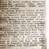 Dr. George Braxton Taylor, of Hollins, Va., pastor of the brides' performed the beautiful ring ceremony. Little Helen Louise Bryant, nice of the Misses Boone, never looked sweeter, dressed in taffeta and net, carrying a white satin pillow, with rings imbedded on a white rose. Miss Virginia Boone, in African Brown, Miss Julia Boone in Copenhagen blue, and Miss Nora Paynter in midnight blue cloth suits, trimmed in handsome fur with pictures hats to match. Mrs. C. E. Argenbright, of Roanoke, matron of honor, in white crepe de chine and lace, Miss Janie Doss, of Roanoke, maid of honor, in white taffeta with tiny yellow rosebuds.