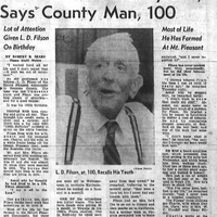 Newspaper article, titled "Worked Hard All My Life, Says County Man, 100," with a photograph subtitled "L. D. Filson, at, 100, Recalls His Youth." The article reads,
