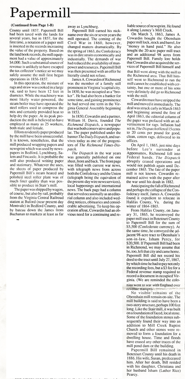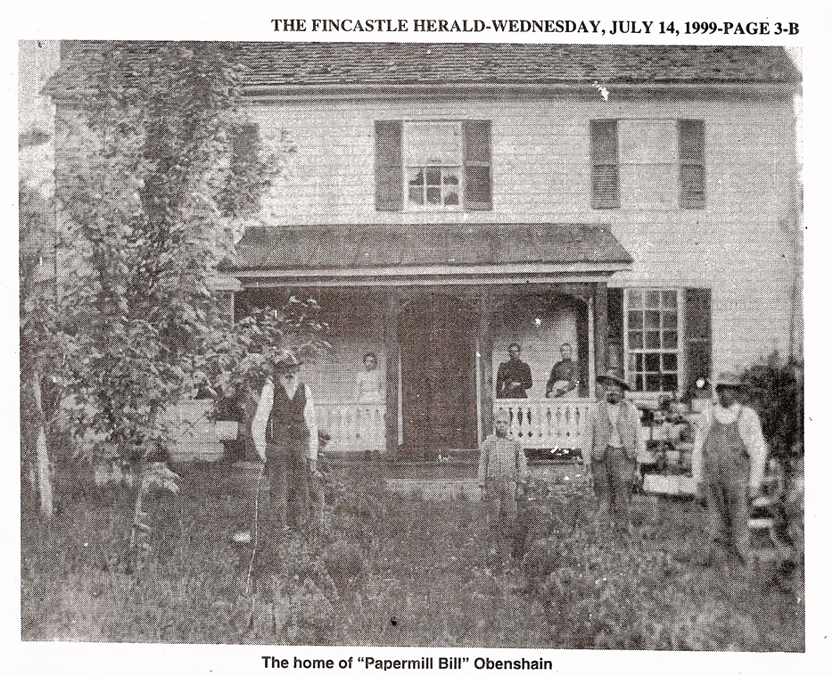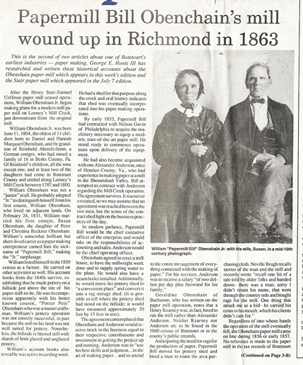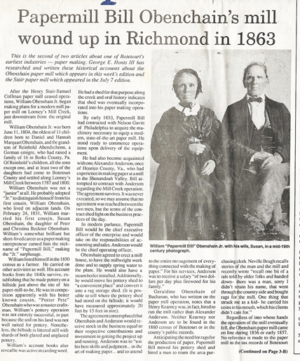 A bio about William "Papermill Bill" Obenchain, born on June 11, 1804, who owned the Obenshain Paper Mill. He died in 1886. Others mentioned in the article include: