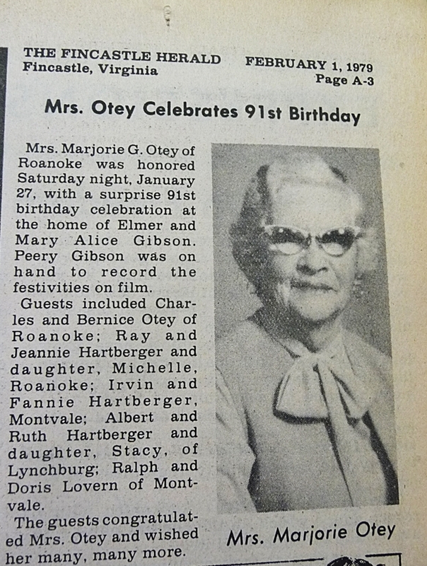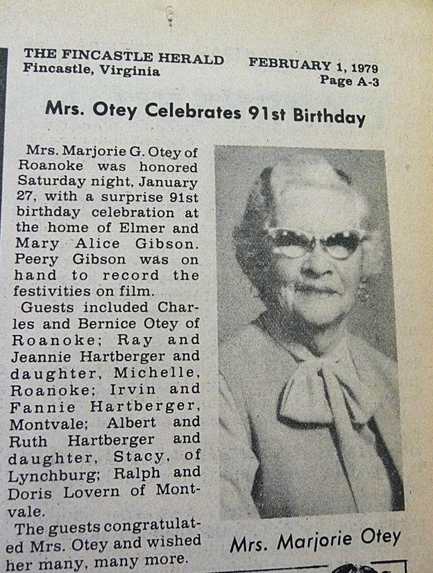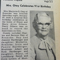 "Mrs. Marjorie G. Otey of Roanoke was honored Saturday night. January 27, with a surprise 91st birthday celebration at the home of Elmer and Mary Alice Gibson. Peery Gibson was on hand to record the festivities on film.