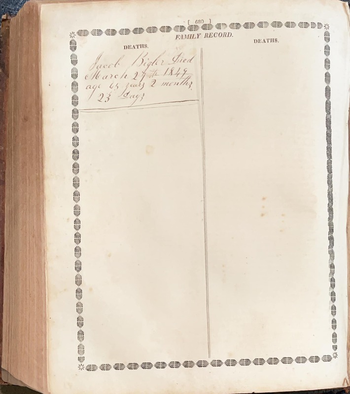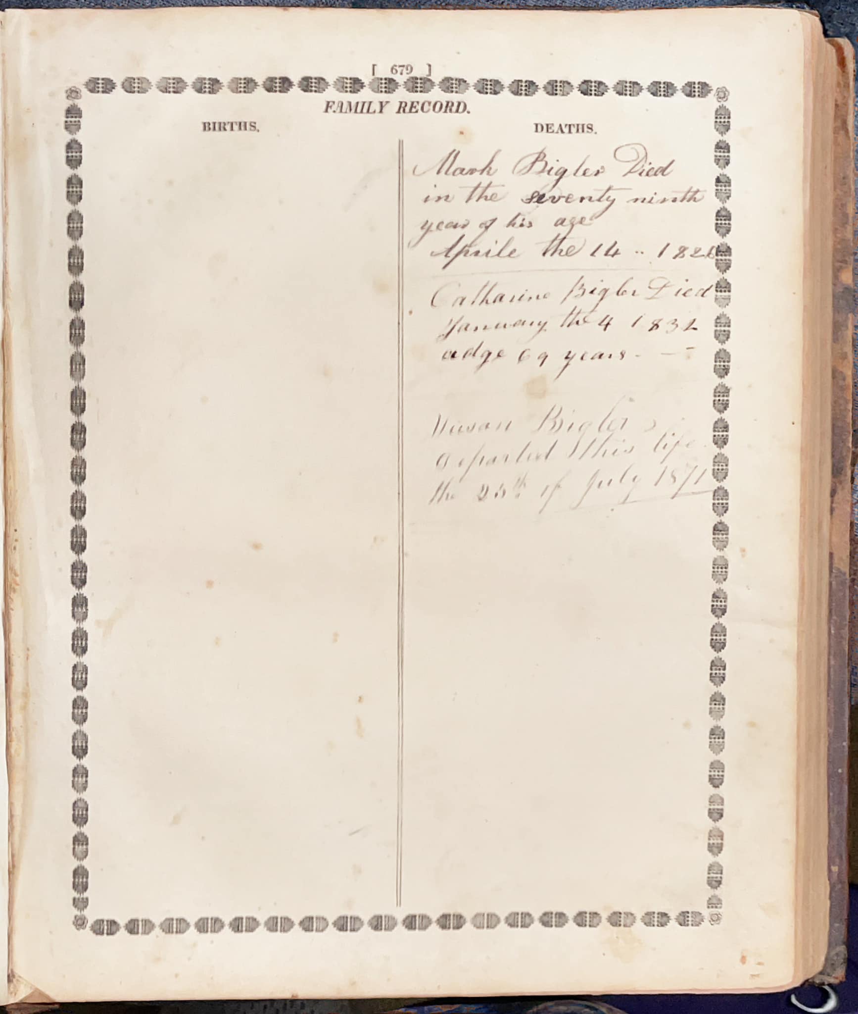 - Pages from the Bigler Family Bible. According to inscriptions, Jacob Bigler purchased the Bible in Fincastle in 1823. He was born January 4th, 1784, and died March 29th, 1849. Mark Bigler died at 79 on April 14th, 1826, and Catharine Bigler died January 4, 1832, at 69. Susannah (listed as Susan) Bigler died July 25, 1871.
