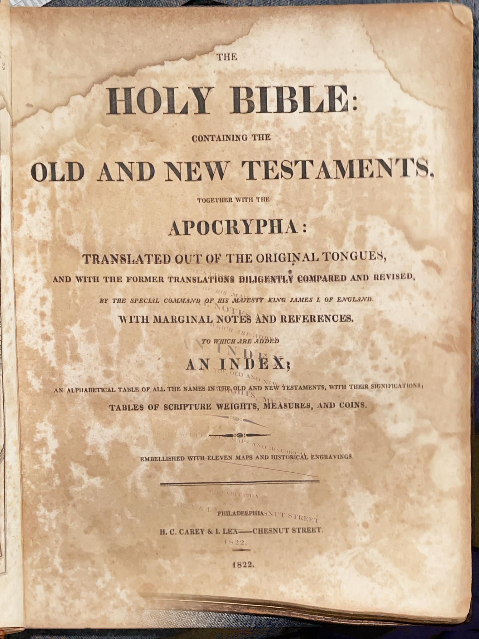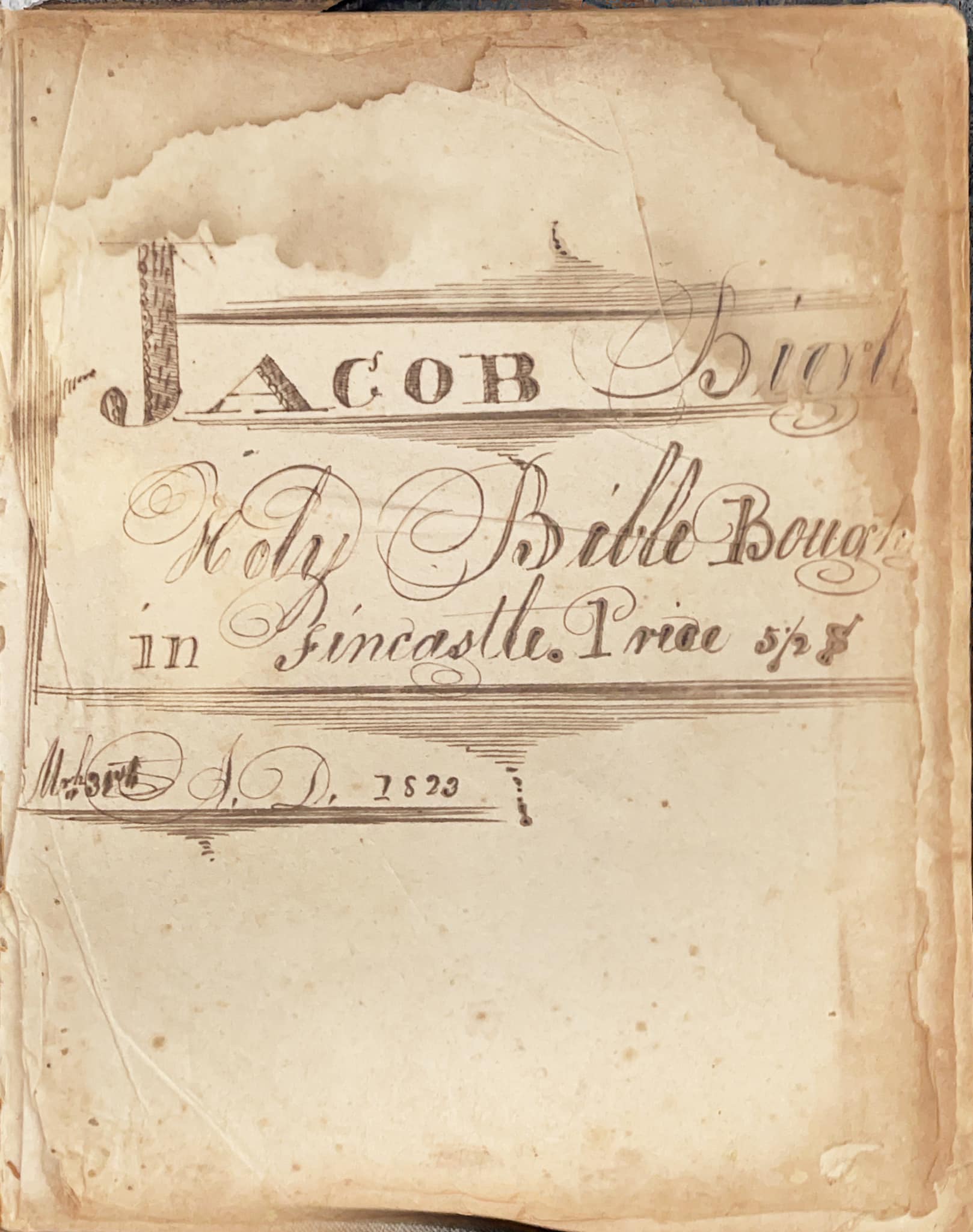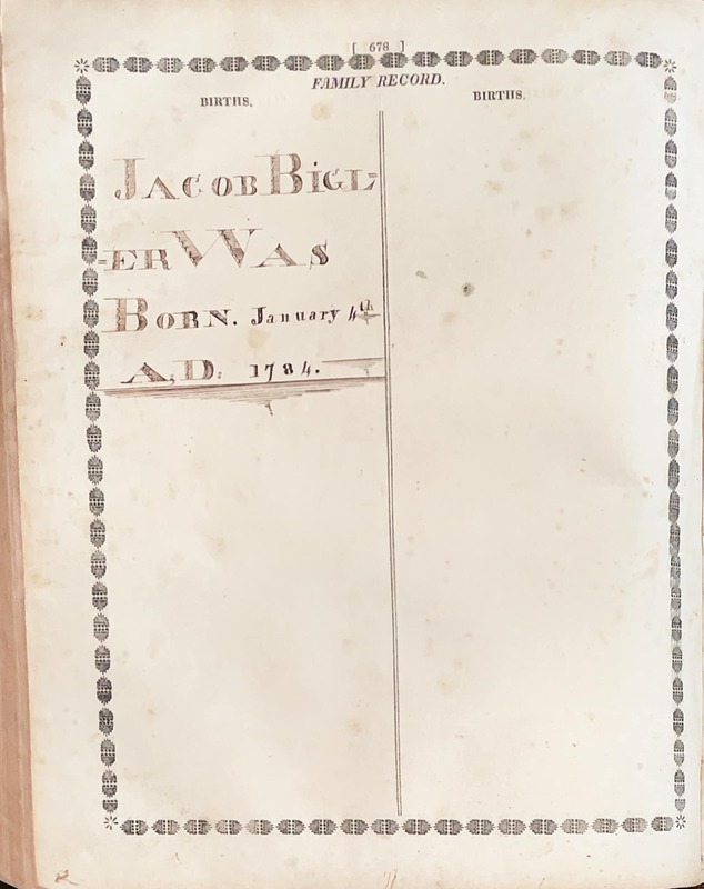 "I’d like to share a Family Bible that was recently given to me. Thanks to Rena Worthen for theBigler Bible FB groups because I was able to meet my 4th cousin Jeanne Douglass. Her 1st cousin, Norman Firebaugh, (also my 4th) had been given this Bible by an auctioneer years ago because the auctioneer didn’t sell Bibles and wanted them to go to family. When Jeanne told him that she was friends with a Bigler, he wanted to meet me and return the Bible to the Bigler Family. This Bible was purchased in Fincastle by Jacob Bigler (1784-1849) in 1823. Jacob and his sister, Susannah (1792-1871) never married and stayed with their parents, Mark Bigler (1747-1826) and Catherine Lease (1763-1832) in the cabin by the Haymakertown Cemetery. Mark Bigler was the first Bigler to settle in Botetourt County in 1785. This 200-year old Bible was purchased during his lifetime and most likely kept in his home during the last few years of his life. I am so grateful that Jeanne put me in touch with Norman and that he was willing to meet me and give me this Bible." - Creator